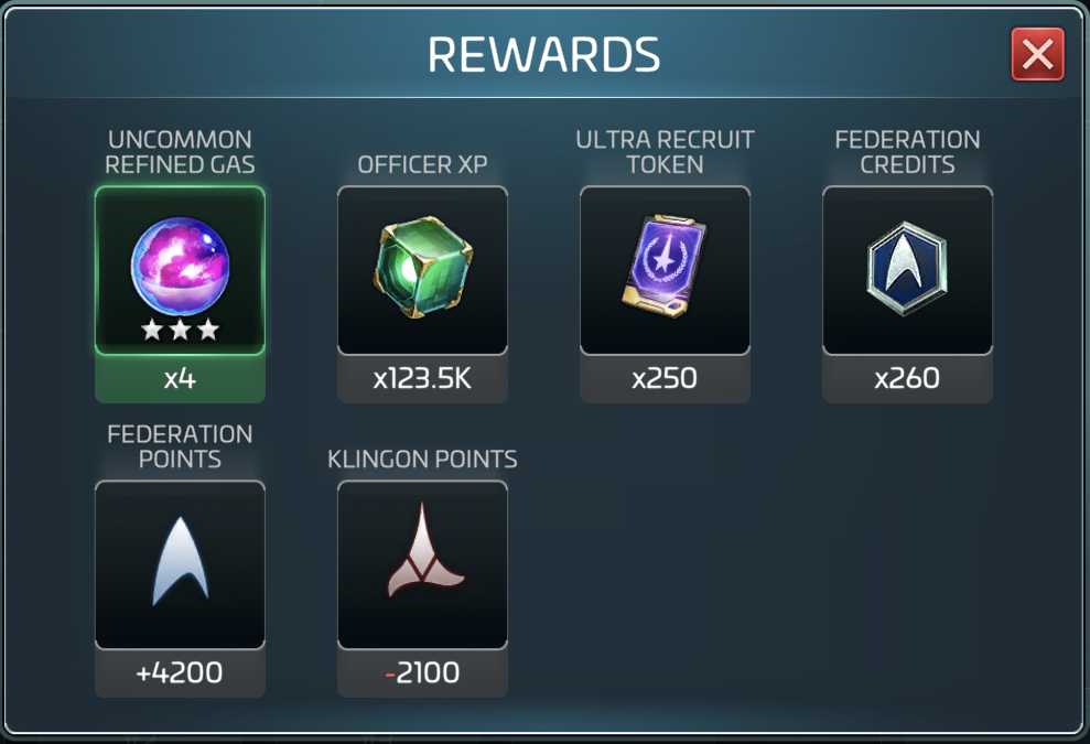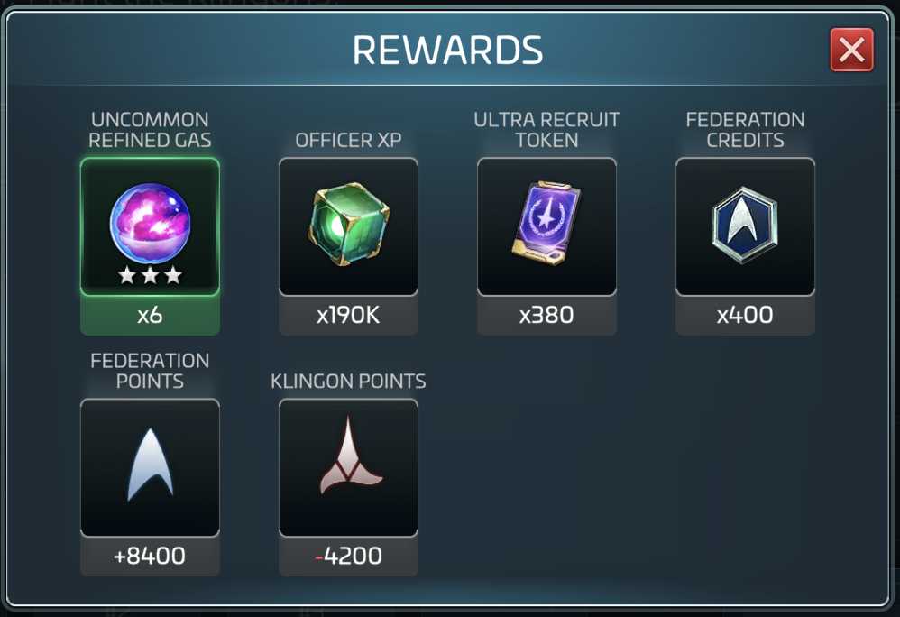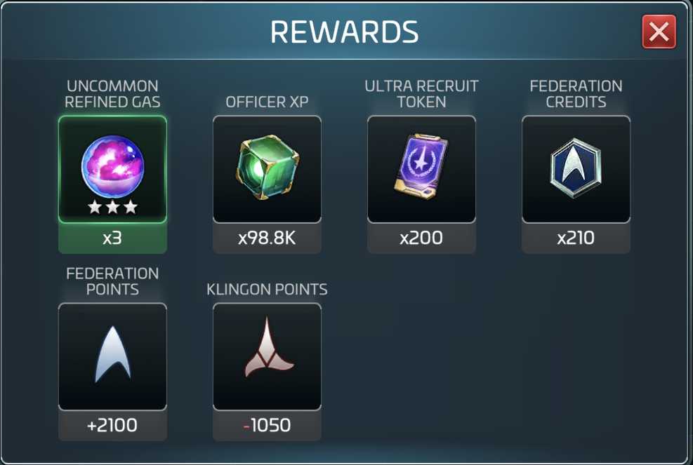 Each faction event will pay out refined materials (ore for the Romulans, gas for the Federation, and crystal for the Klingons.) You’ll also get recruiting tokens, officer XP, faction reputation points, and most importantly, Faction Credits.