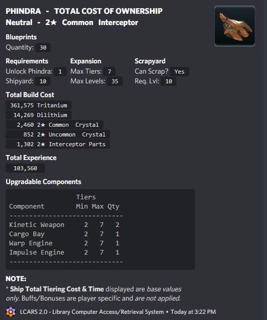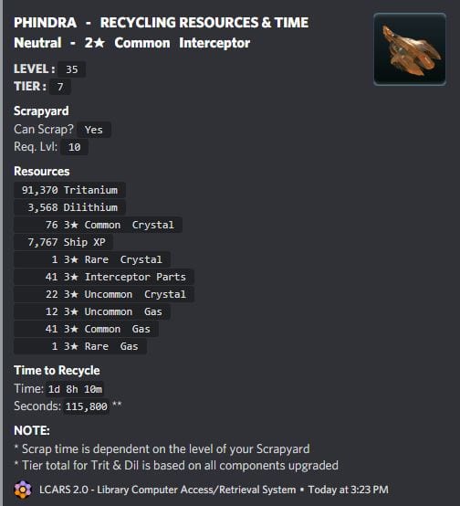 The Phindra is a great build-and-scrap ship, especially if you’re working on a Saladin, Horizon, or other ship that needs 3* crystal. You put in 2* crystal and 2* interceptor parts, and you get 3* uncommon and rare crystal, 3* uncommon and rare gas, and 3* interceptor parts in return. By the time I was ready to build my Saladin, I was loaded with 2* parts and materials, so I had these things building, upgrading, and scrapping on a regular basis. It’s a great way to take your useless leftovers into useful assets.